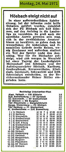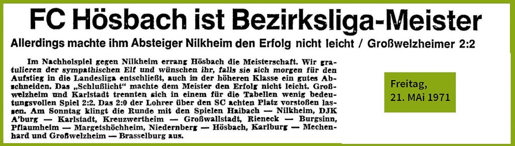 Zurück zur Hösbacher Meistersaison: Am 20. Mai 1971, dem Vatertag, sicherte sich der FCH mit einem mühevollen 1:0 im Nachholspiel gegen Schlusslicht VfR Nilkheim den Titel, den Treffer erzielte Herbert Brand. Vier Tage zuvor hatte Alfred Heeg den Spitzenreiter vor 1000 Zuschauern zum vorentscheidenden 2:1-Erfolg gegen Verfolger TSV Karlburg geschossen – nach einer kleinen Schwächeperiode mit drei Niederlagen aus fünf Partien.